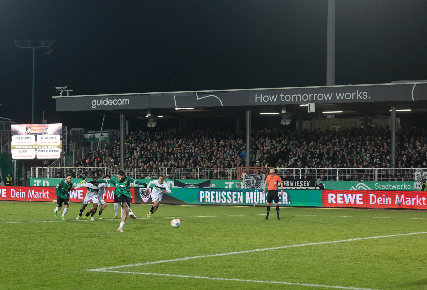 Der zweite Stoß – diesmal gegen Lokotsch – führte dann aber tatsächlich zum Elfmeter. Den verwandelte Batista Meier in der 92. Minute sicher. Der Anschlusstreffer setzte die letzten Kräfte frei. Münster war alles nach vorn und erzwang sich sein Glück. Mit Glück landete der Ball vor den Füßen von Zidan Sertdemir, der schön ins lange Ecke zielte und traf. Dann war nur noch Jubel und Stolz.