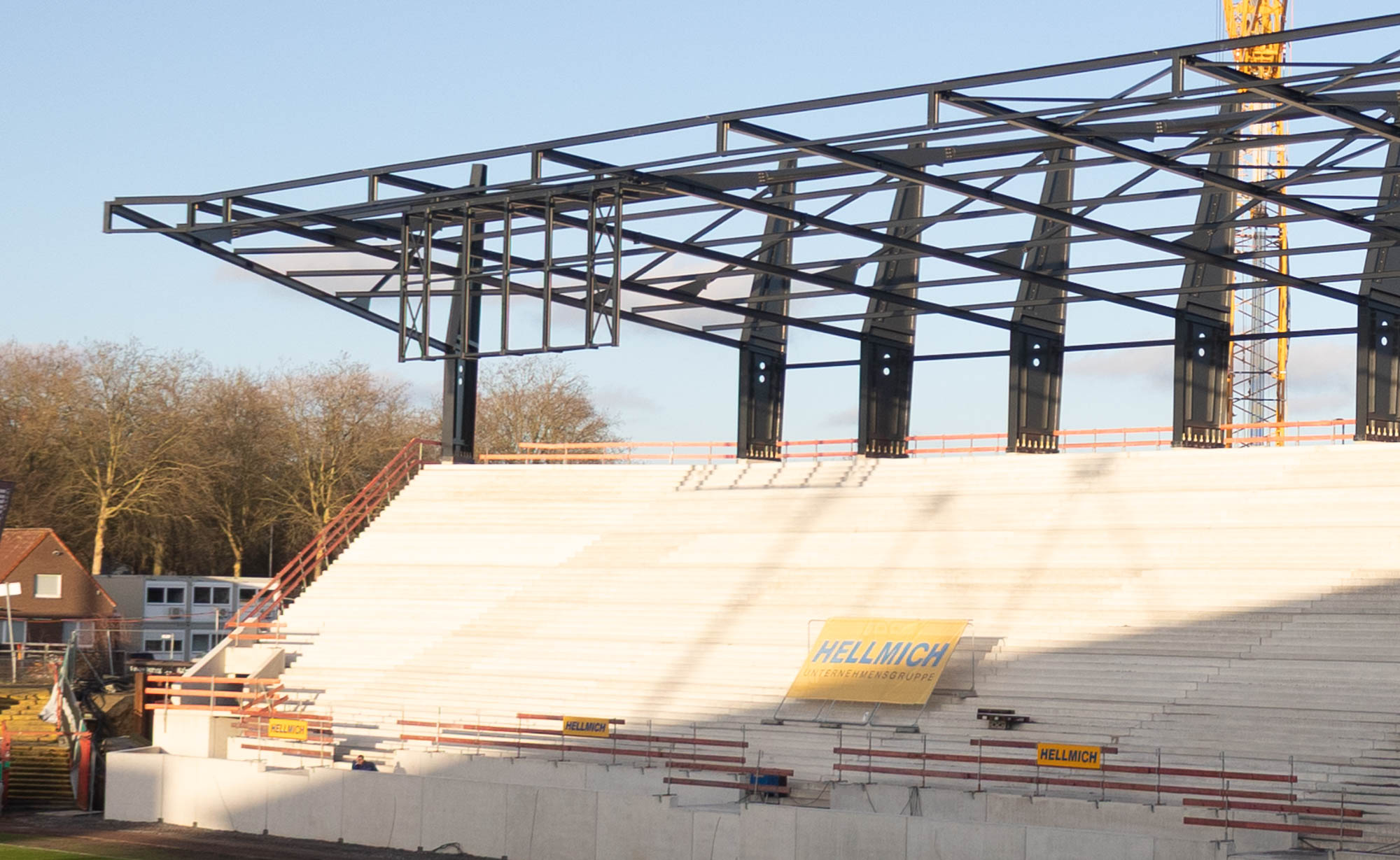 Das Gerüst für die Videoleinwand im Osten wurde durch das Stahlbauunternehmen bereits installiert – das ging im Osten deutlich früher als auf der anderen Seite. Im Osten ist auch die Dachblende bereits vorbereitet, an der später einmal zusätzliche Vermarktungsflächen entstehen werden – auch wenn man vermuten darf, dass über der Fiffi-Gerritzen-Kurve nicht unbedingt Werbebotschaften angebracht werden.