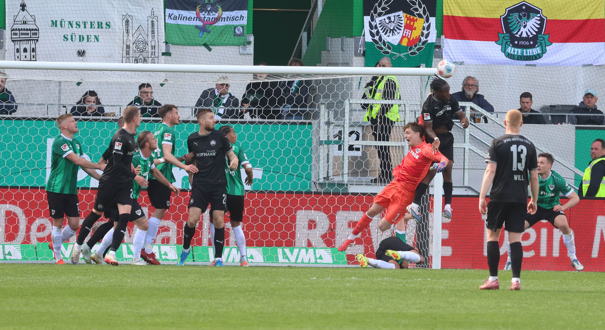 Nach dem Seitenwechsel wirkte der SC Preußen nach kurzem Anlauf endlich mal so energisch, wie man sich das im Abstiegskampf wünschen würde. Da kamen ein paar Aktionen hintereinander, die auch das Publikum etwas aufweckten. Ein Eckball landete nach Umwegen knapp vor der Torlatte, ehe Keeper Prüfrock ihn zur nächsten Ecke lenkte. Die wurde dann auch wieder gefährlich, weil Fürths Keeper vorbeirauschte, aber Mees nicht genug Druck auf den Ball bekam. Und dann die beste Szene: Mees profitierte von einem Ballverlust der Früher, war plötzlich frei – und spielte Fürths Torwart aus, brachte den Ball aber dann nicht im leeren Tor unter, weil Will gerade noch in letzter Sekunde ein Bein vor den Ball bekam.