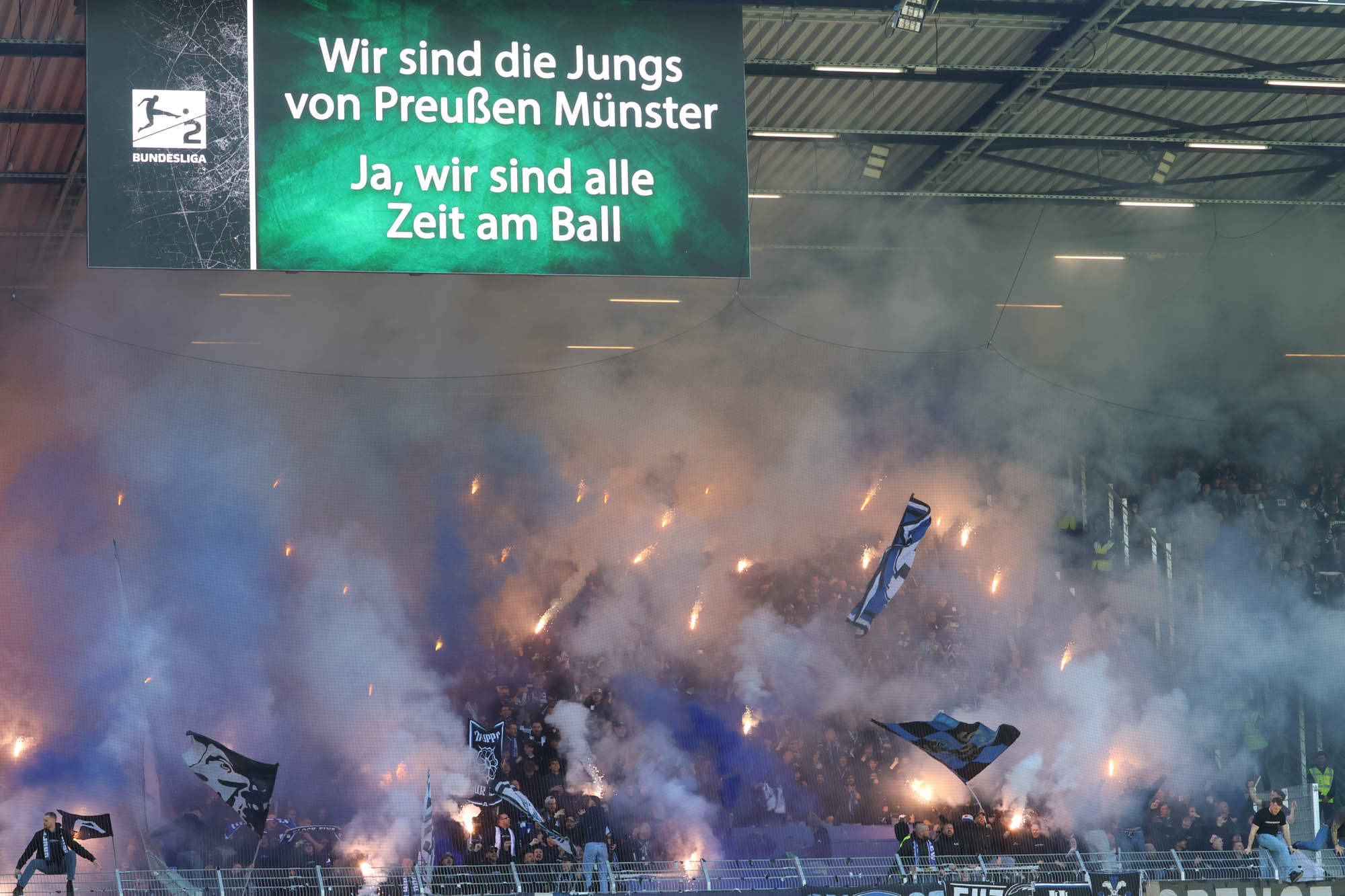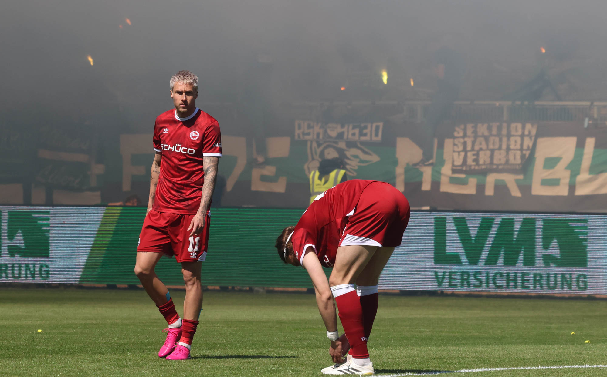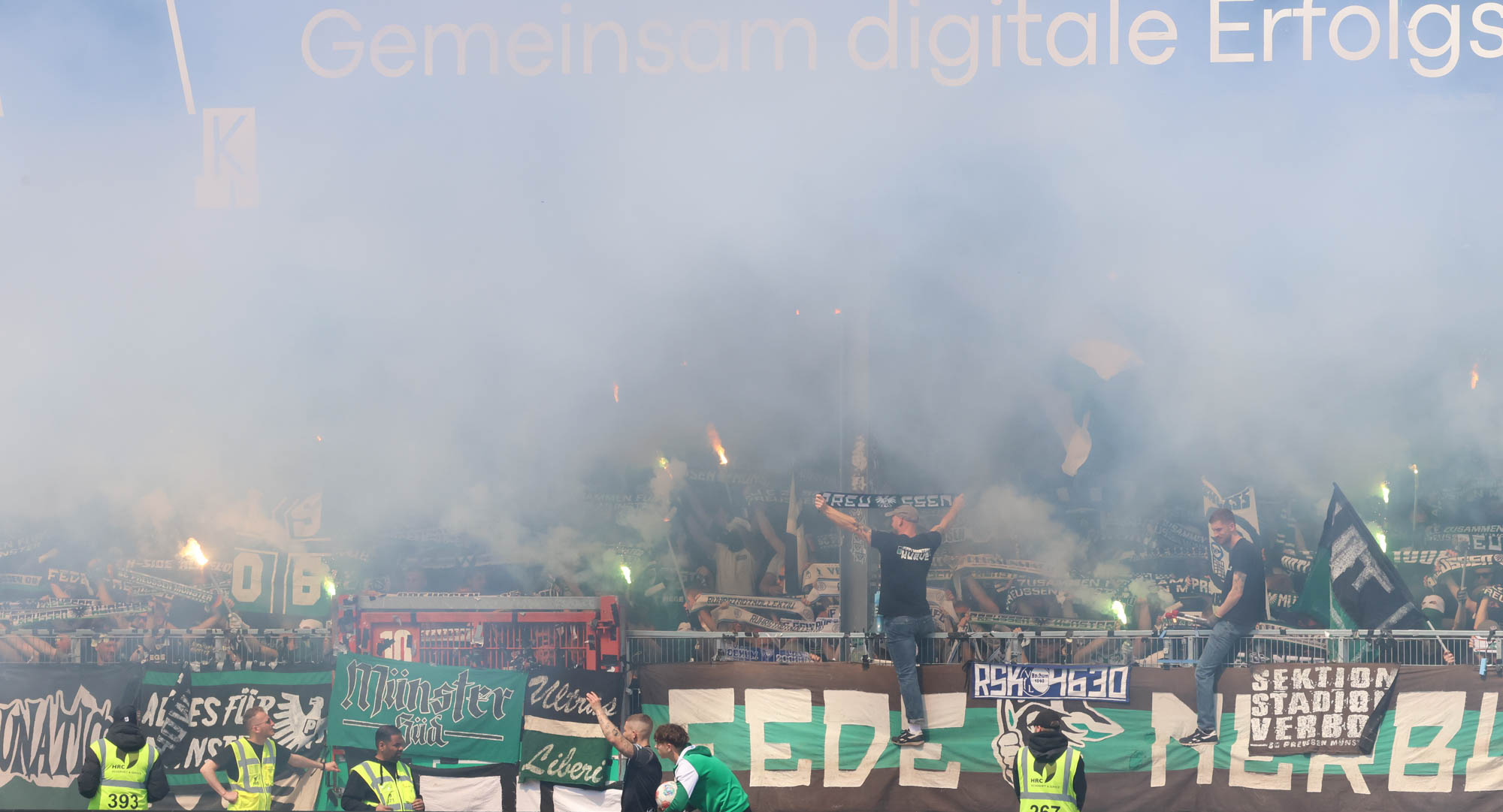 Kurz vor der Pause stellten beide Fanlager den Support ein. Auf der Gegengerade musste ein Zuschauer behandelt werden, während dieser Zeit schwiegen Arminia- und Preußenfans. Es handelte sich aber nicht um einen dramatischen Zwischenfall, also ging es in der zweiten Halbzeit wieder normal weiter.