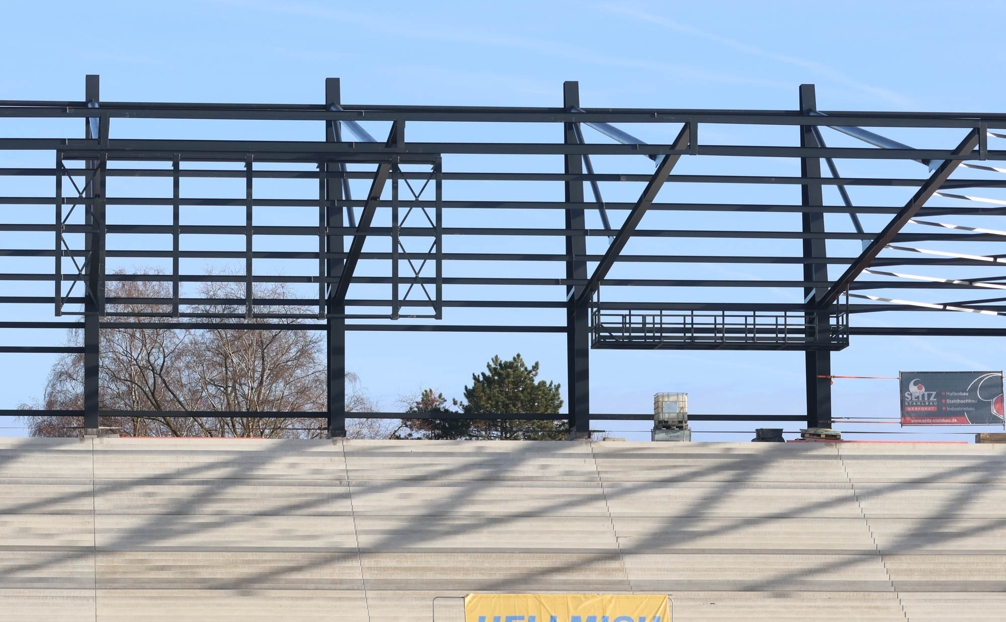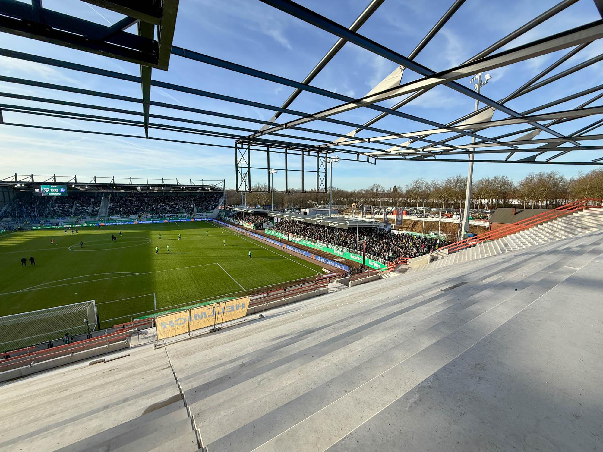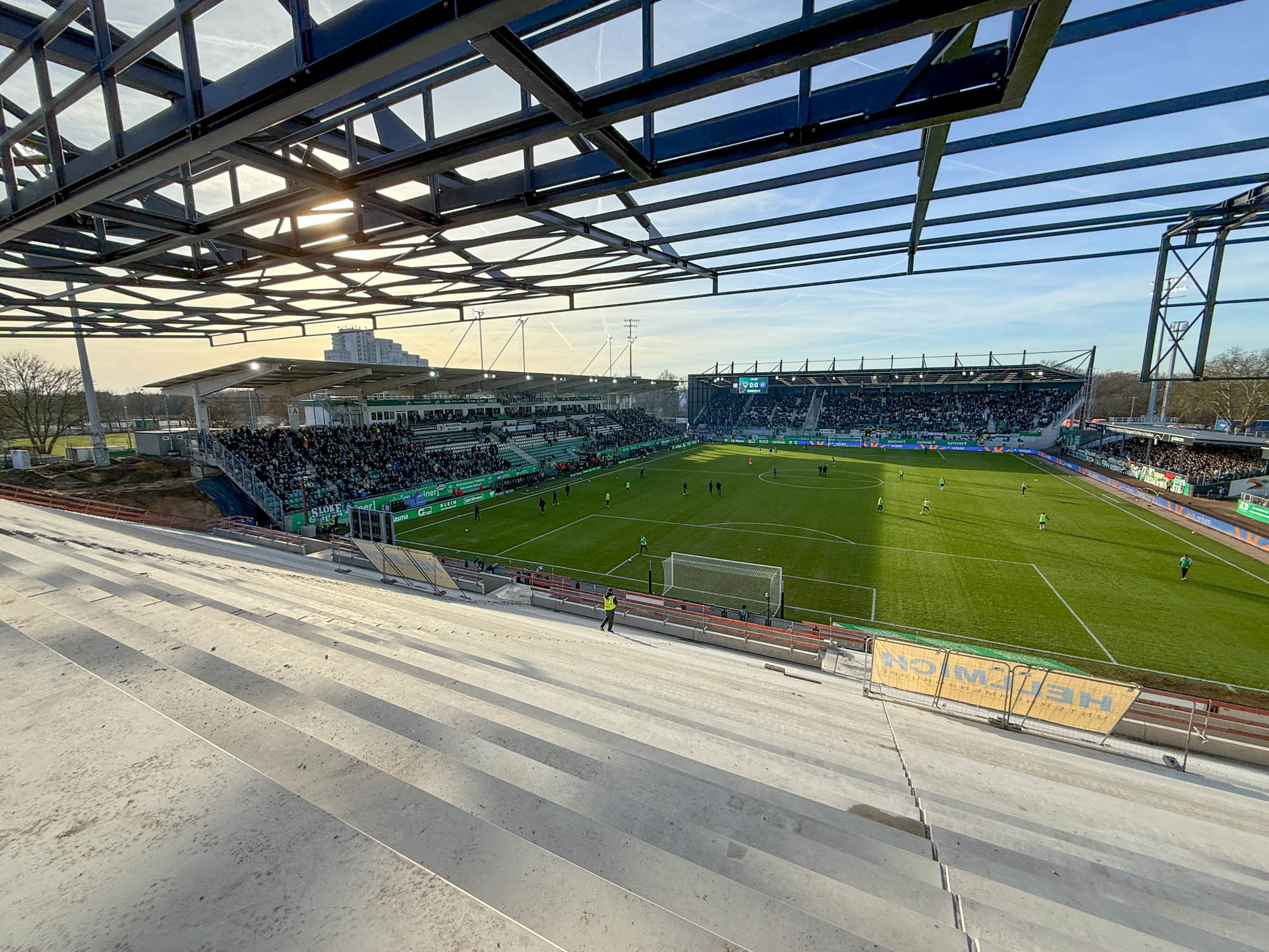 Längst gewohntes Bild ist, dass zwischen zwei Heimspielen die LED-Banden vor der West- und Osttribüne geräumt werden. Hier geht es darum, Platz zu schaffen für die Hubsteiger. Im Westen soll nun auch das Gerüst für die Dachbanden installiert werden, daher braucht es erneut Platz.