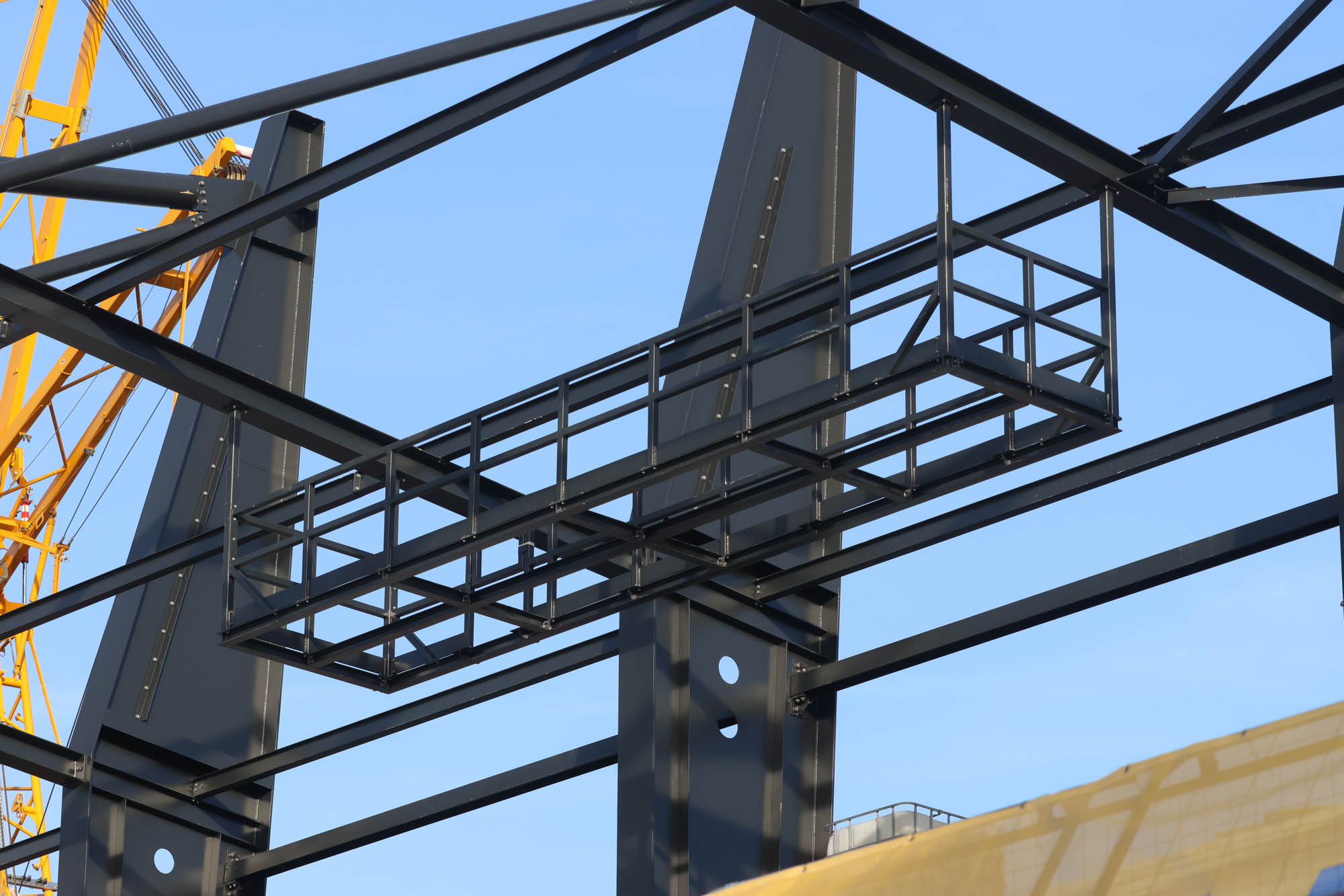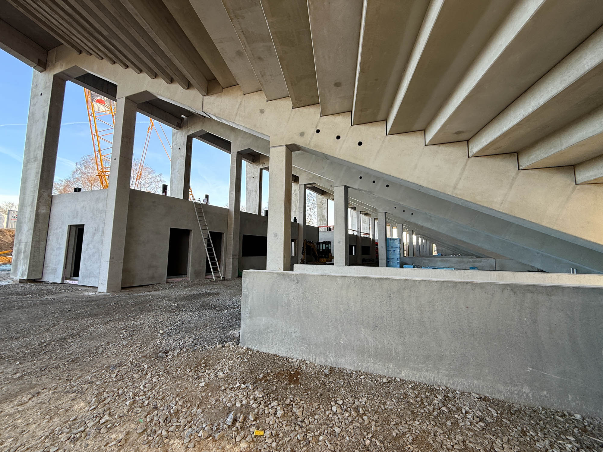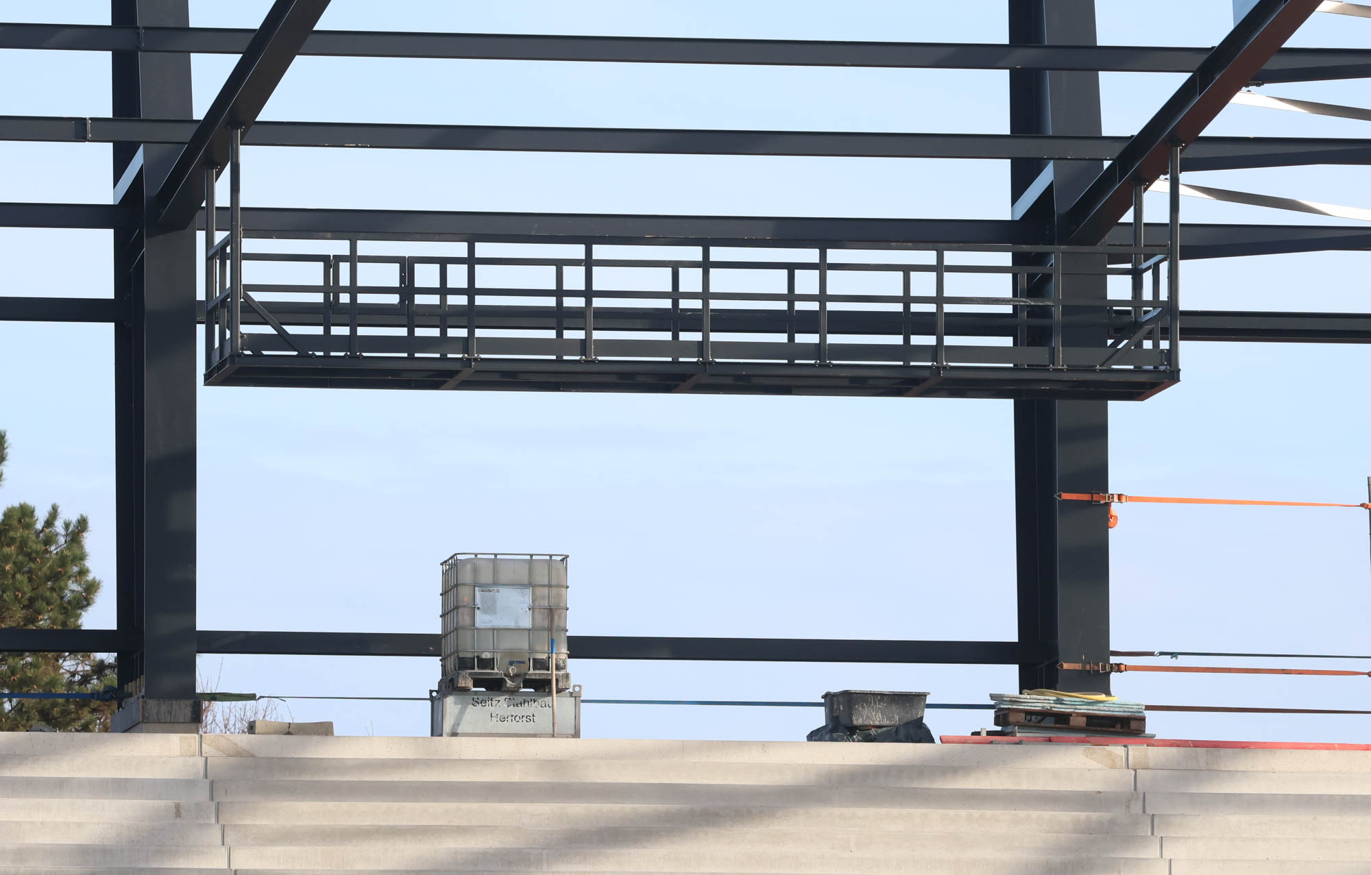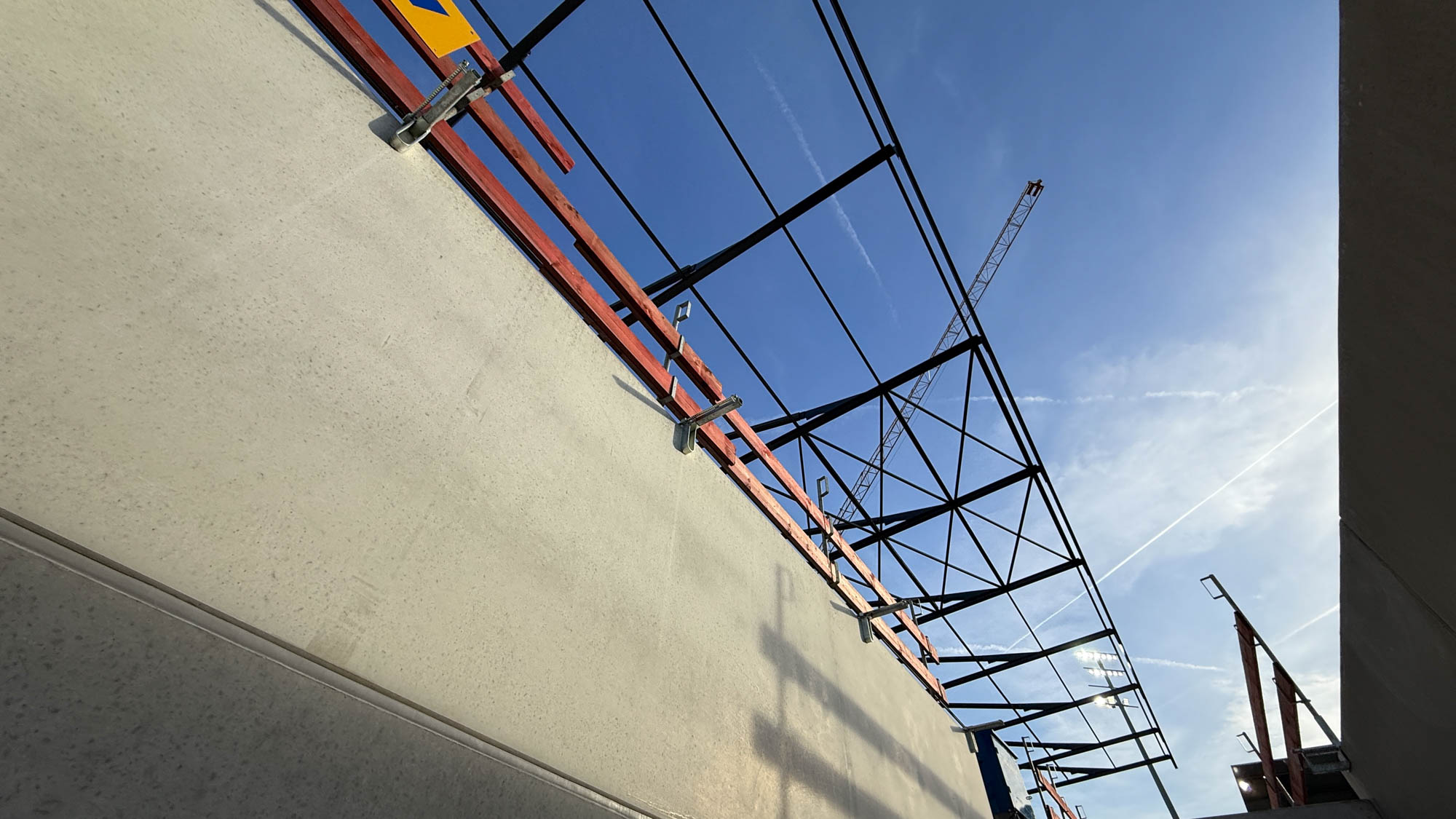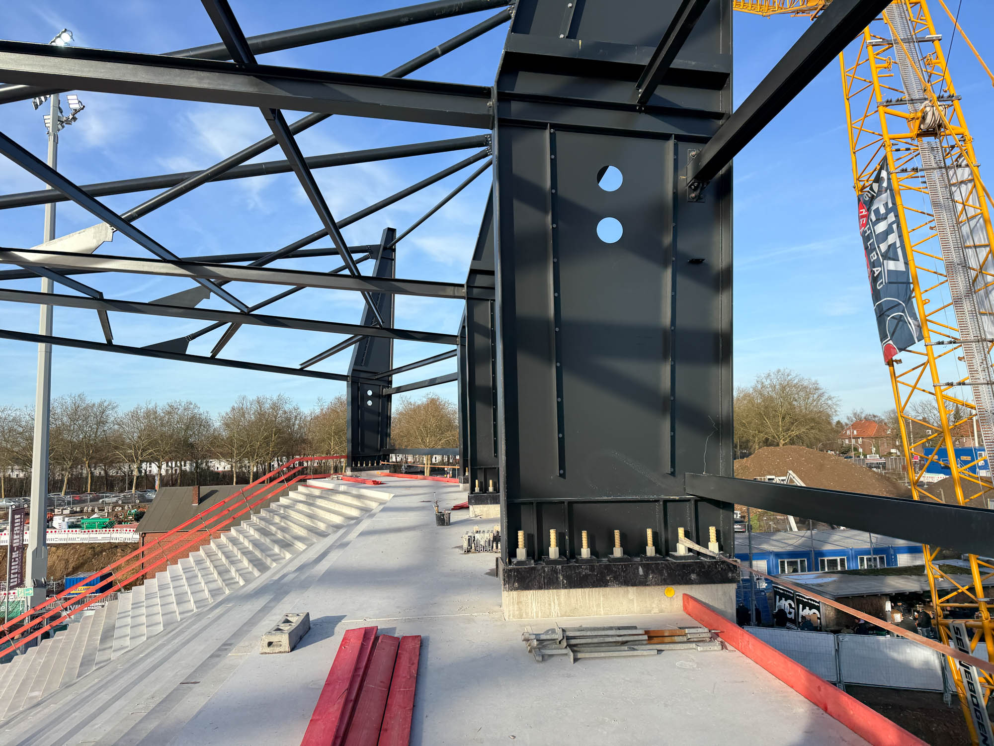 Am Montag ging es erst einmal nicht mit sichtbaren Arbeiten an der Tribüne weiter – sondern mit einem Abbau dahinter. Der schwere Raupenkran wurde demontiert, der Rest der Anlage kann von „normalen“ Autokränen viel besser und flexibler erledigt werden. So war es auch gegenüber bei der Westtribüne. Vielleicht wird es ein drittes Wiedersehen geben, sobald die Nordtribüne in die Höhe gebaut wird. Der Abriss der heutigen Gegengerade wird wohl, das ist zumindest der Plan, in der Sommerpause begonnen. Voraussetzung dafür ist, dass die Ostkurve nutzbar ist. Und damit das gelingt, wird parallel gearbeitet. Oben waren zuletzt die Stahlbauer beschäftigt, unten ging es um den Innenausbau.
