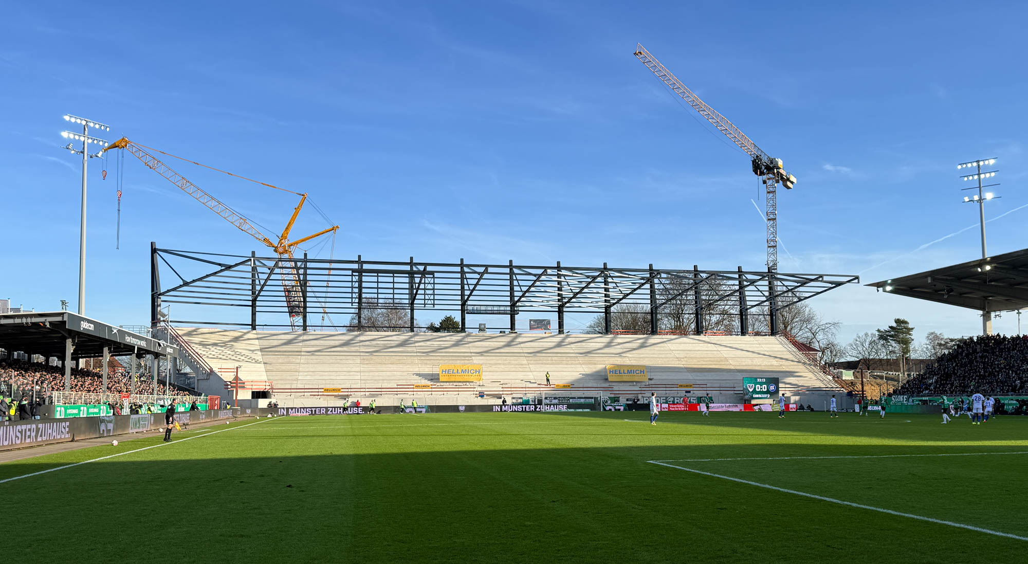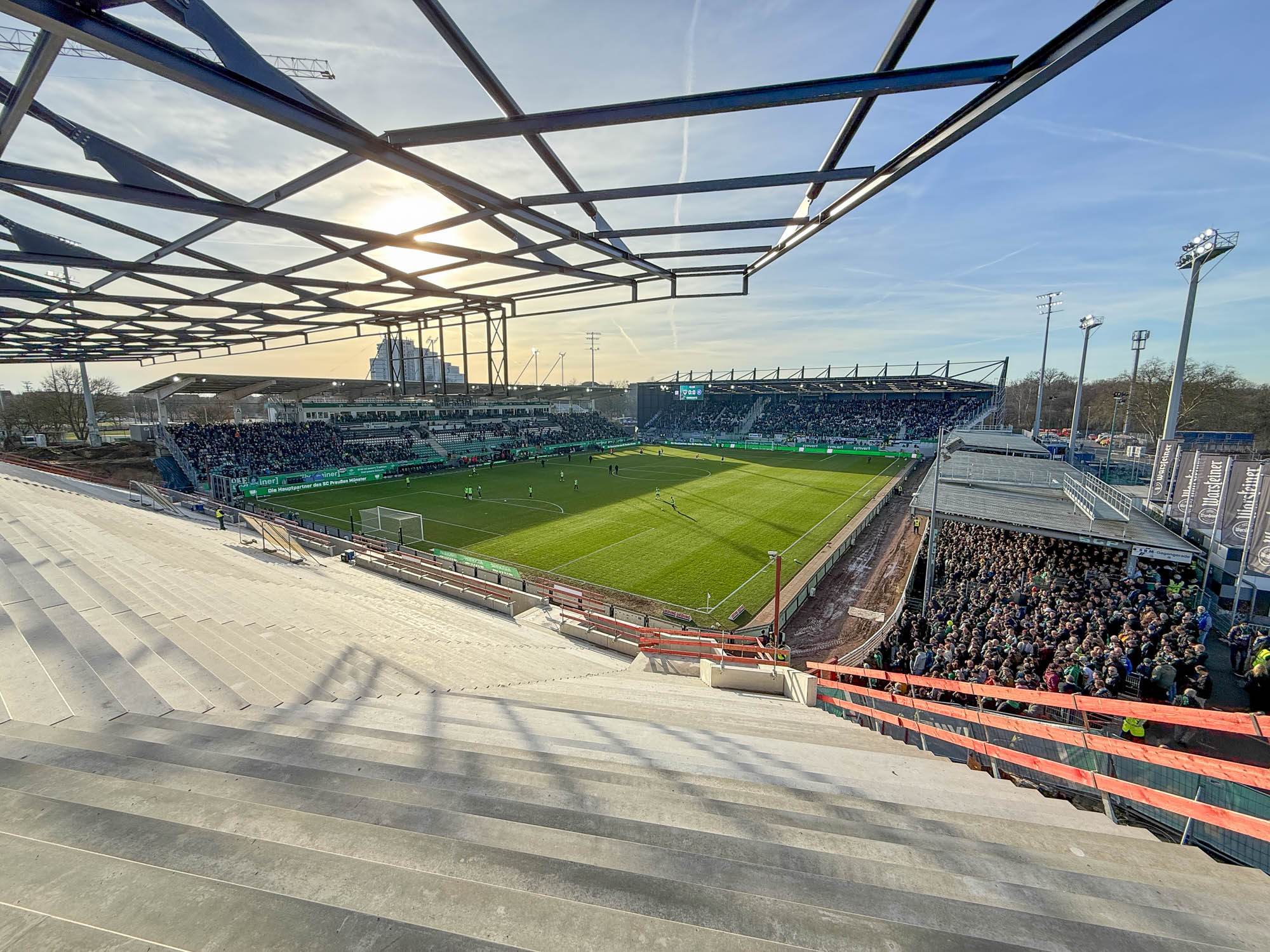 Wann exakt die neue Osttribüne, die im Volksmund wohl eher die Ostkurve bleiben wird, nutzbar ist, bleibt vorerst noch offen. Zu viele Einflüsse spielen in diese Frage herein, als dass ein exakter Termin genannt werden könnte. Vielleicht klappt’s im Laufe der Rückrunde, offiziell aber zum Start der kommenden Saison. So formulierte es zuletzt die Stadt Münster.