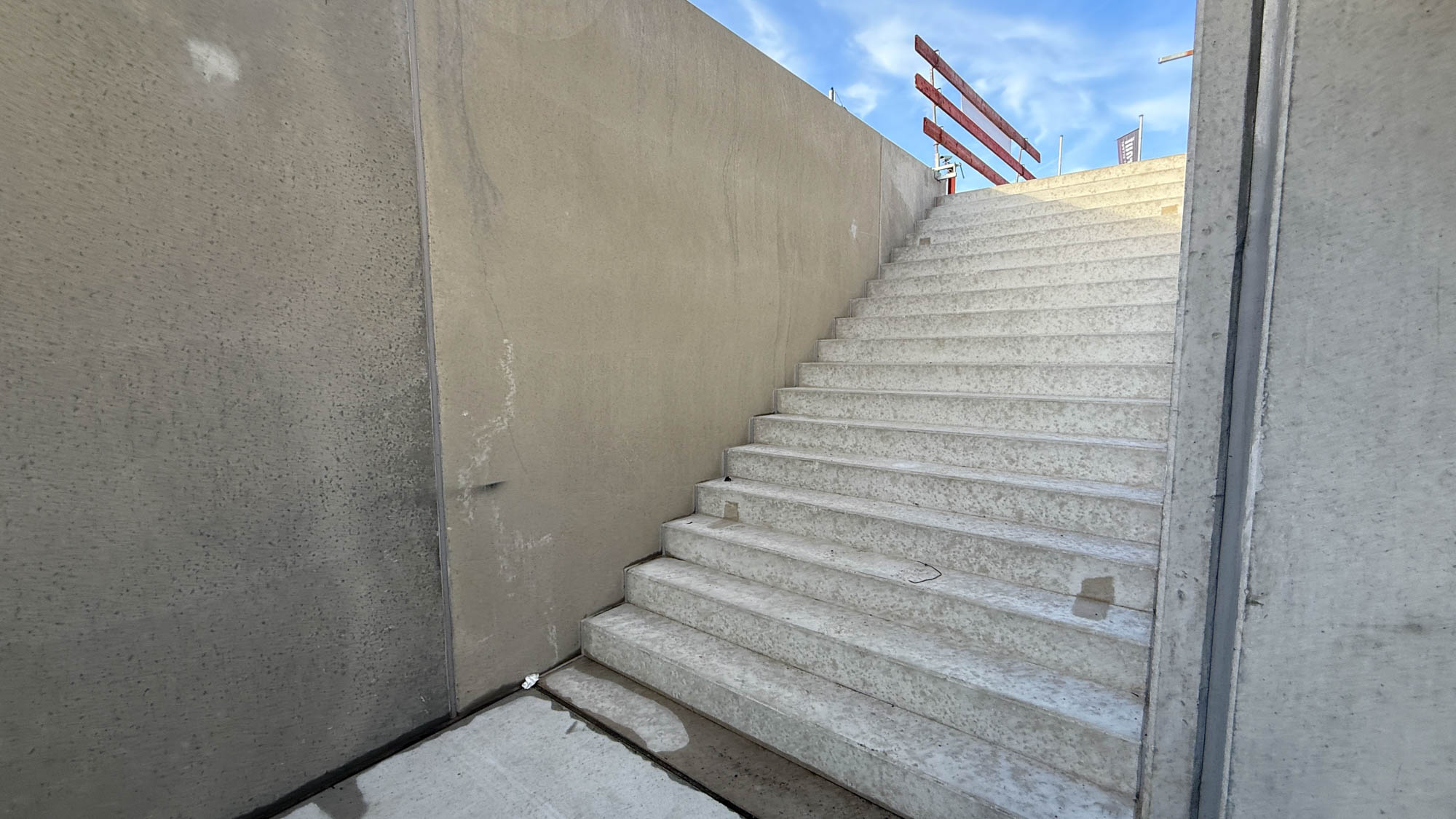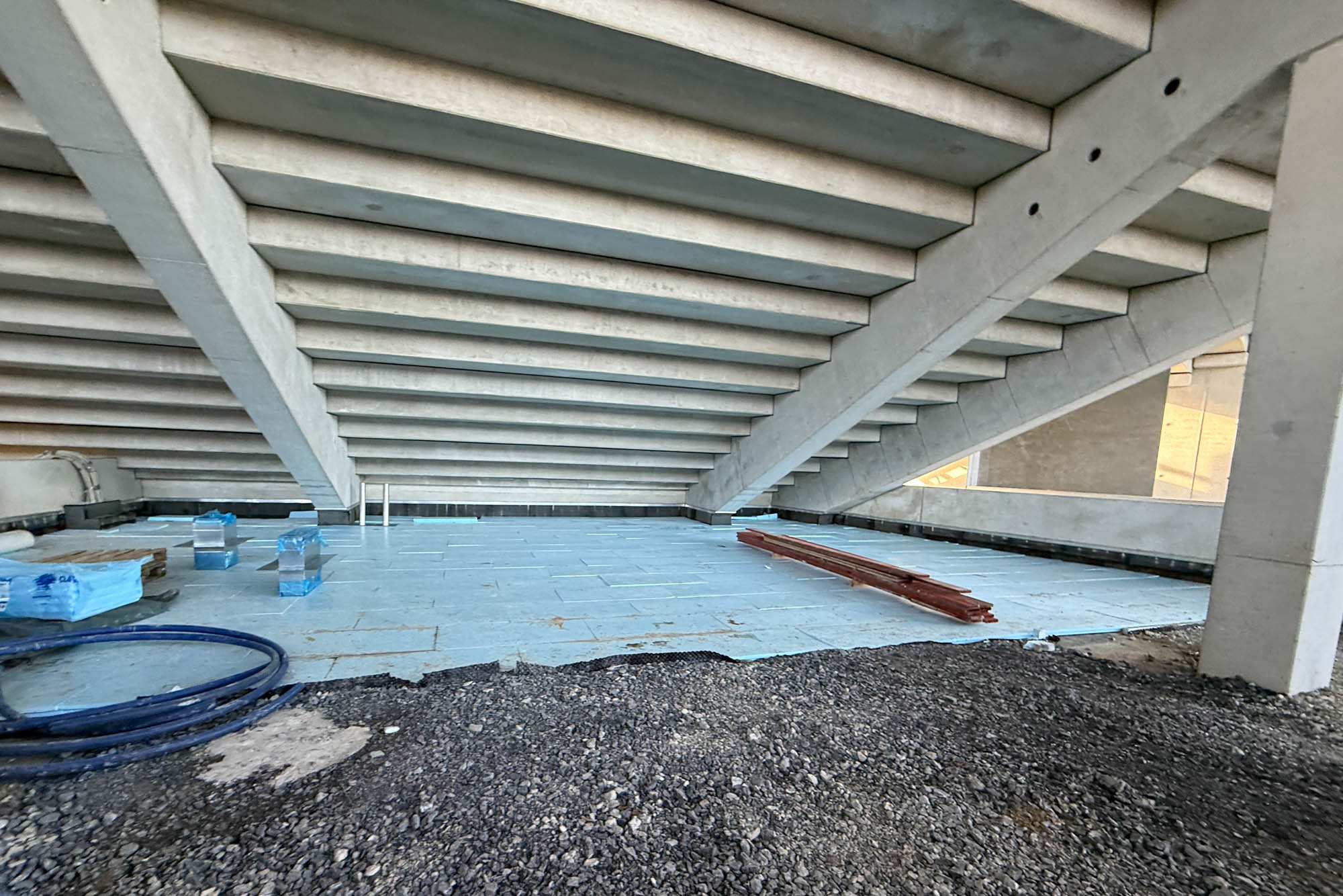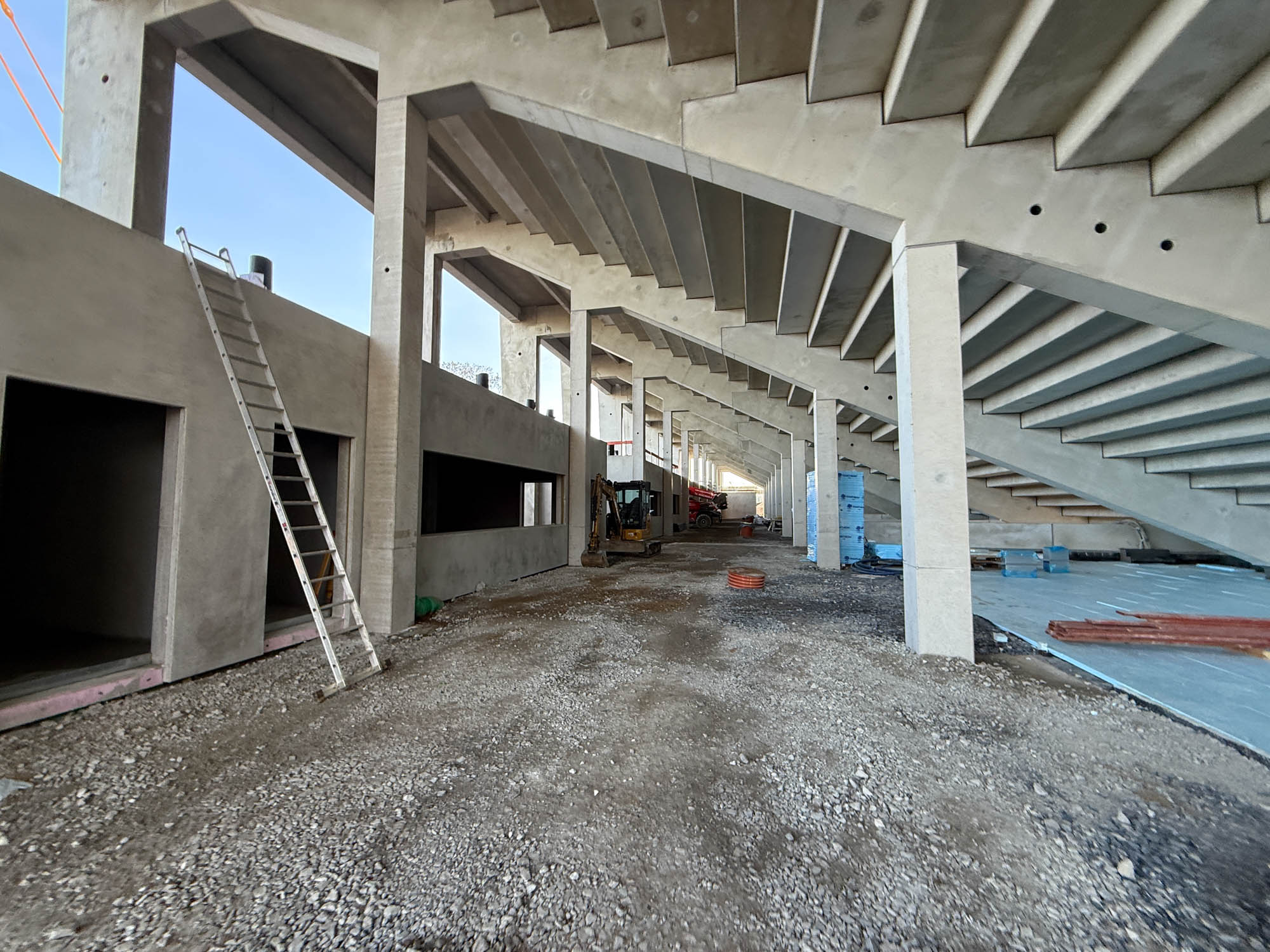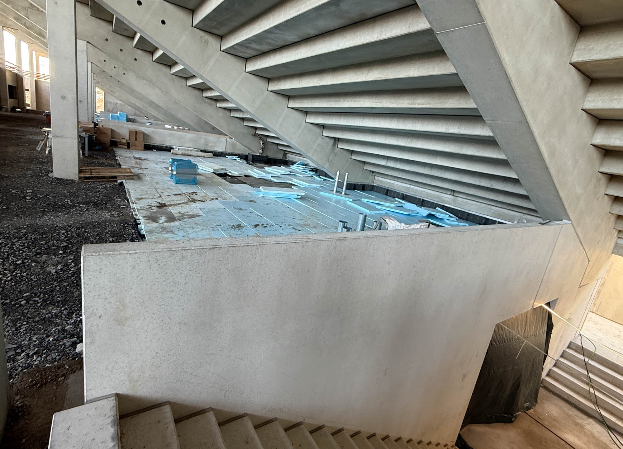 Eine Etage darüber, auf dem Dach der tiefergelegten WC-Anlagen, sind die Flächen abgedichtet worden. Hier entsteht zusätzlicher Aufenthaltsbereiche für Fans. Nicht vergessen: Im Osten finden irgendwann einmal weit über 8.000 Fans Platz. Und die brauchen etwas mehr Bewegungsraum als unter der Westtribüne. Daher wirkt die künftige Ostkurve auch etwas luftiger „untenrum“.