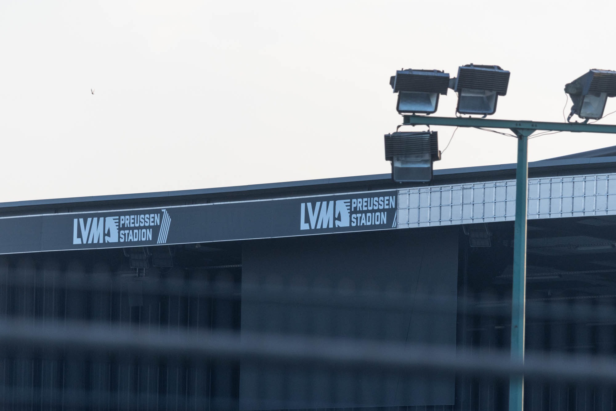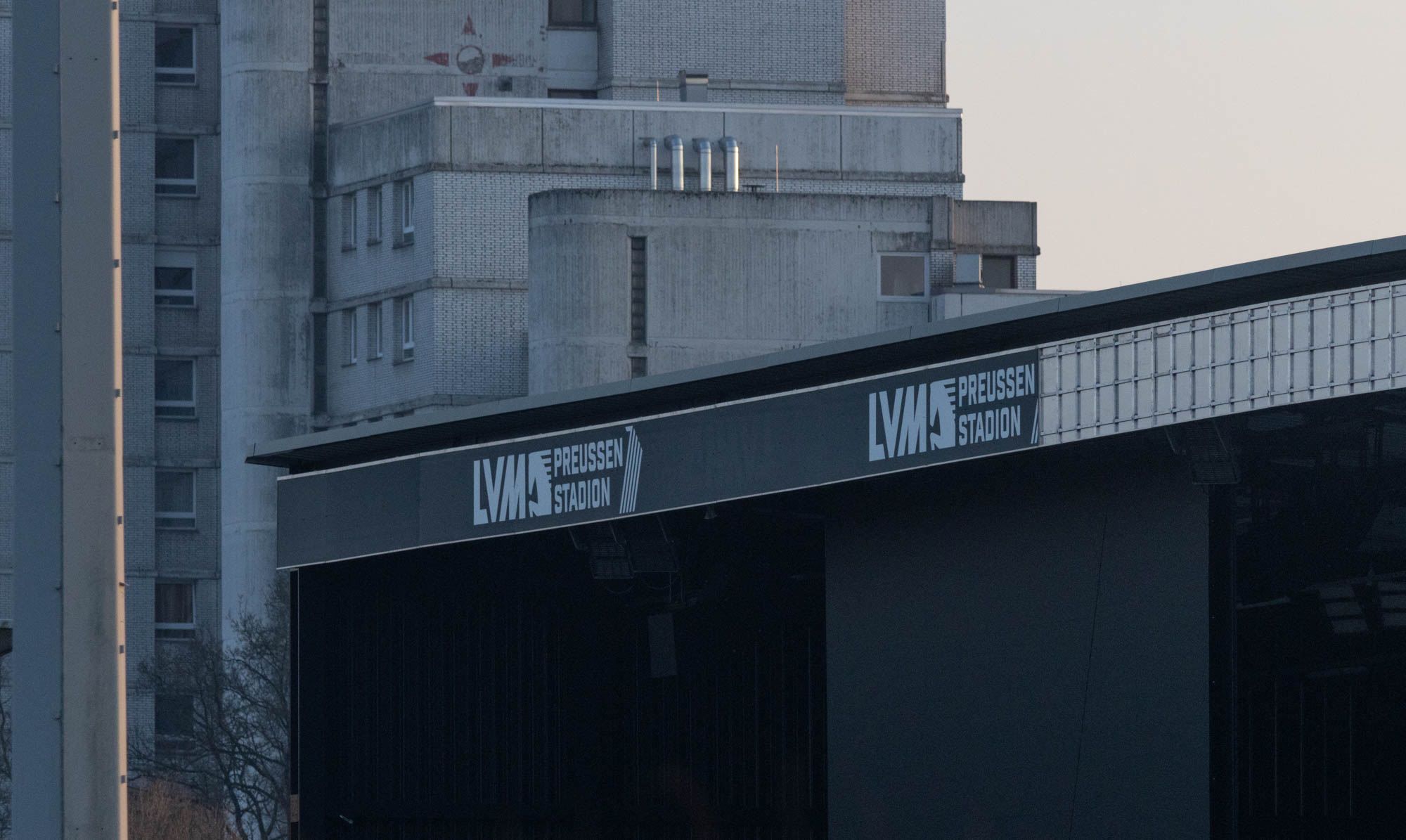 Augenfällig sind beispielsweise die neuen Werbebanden, die am oberen Dachrand der neuen Westtribüne angebracht werden. Die etwa einen Meter hohen Flächen wurden bereits teilweise bestückt – dort ziert das Logo des LVM-Preußenstadions die ersten Banden.