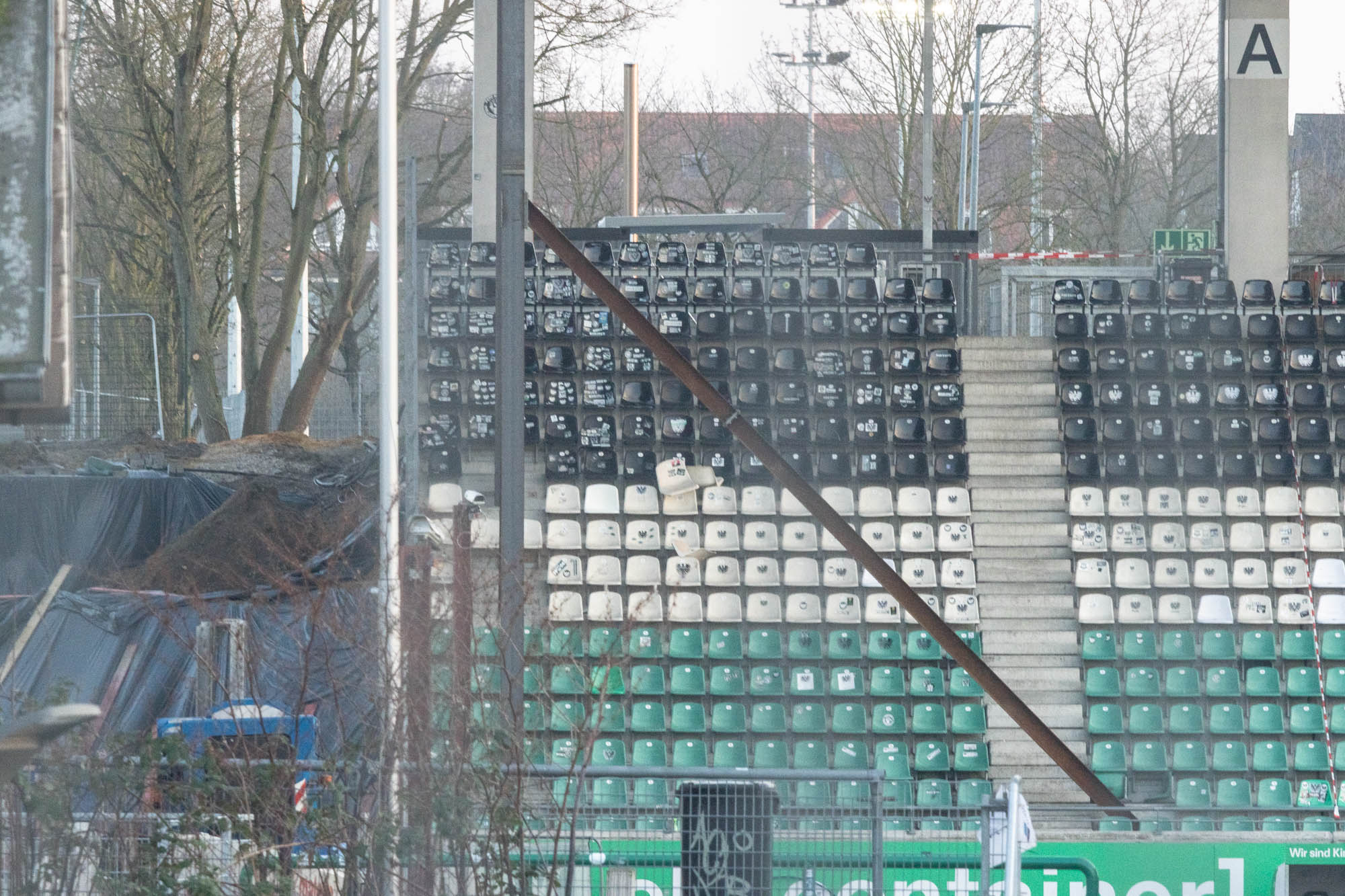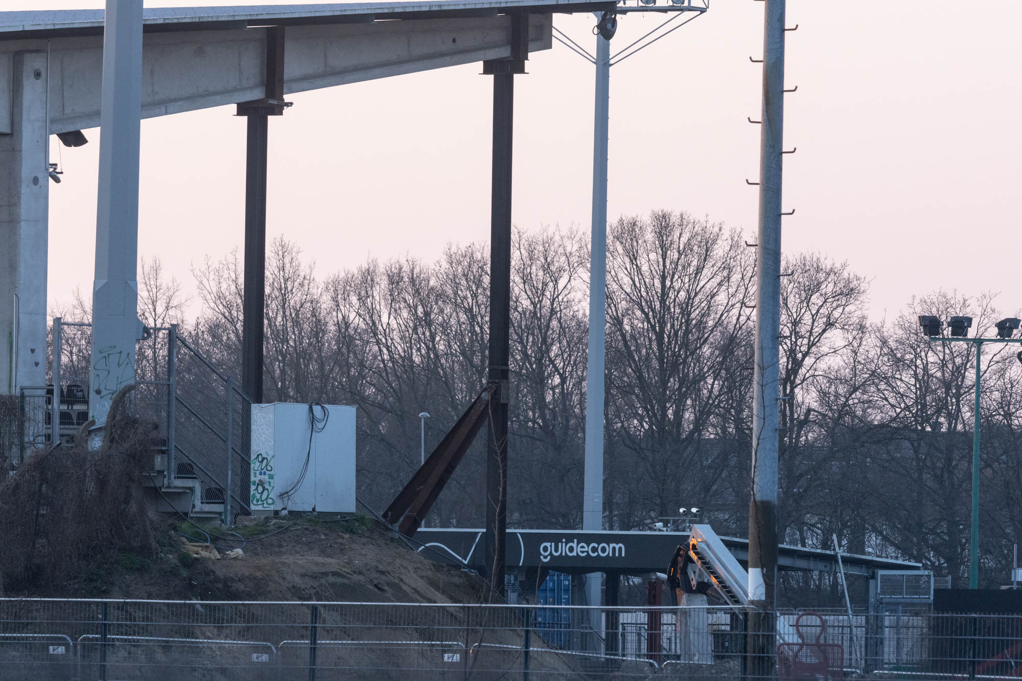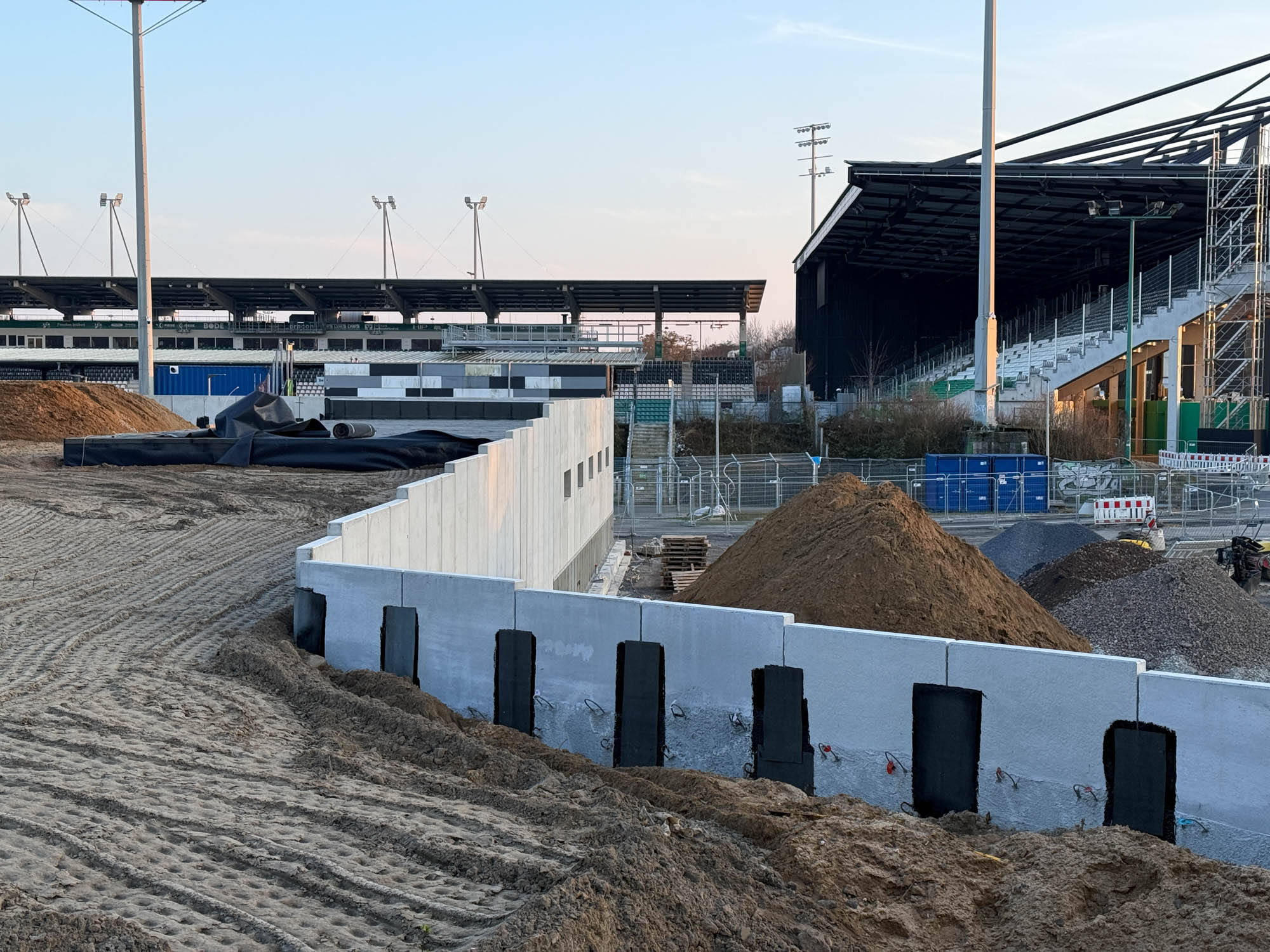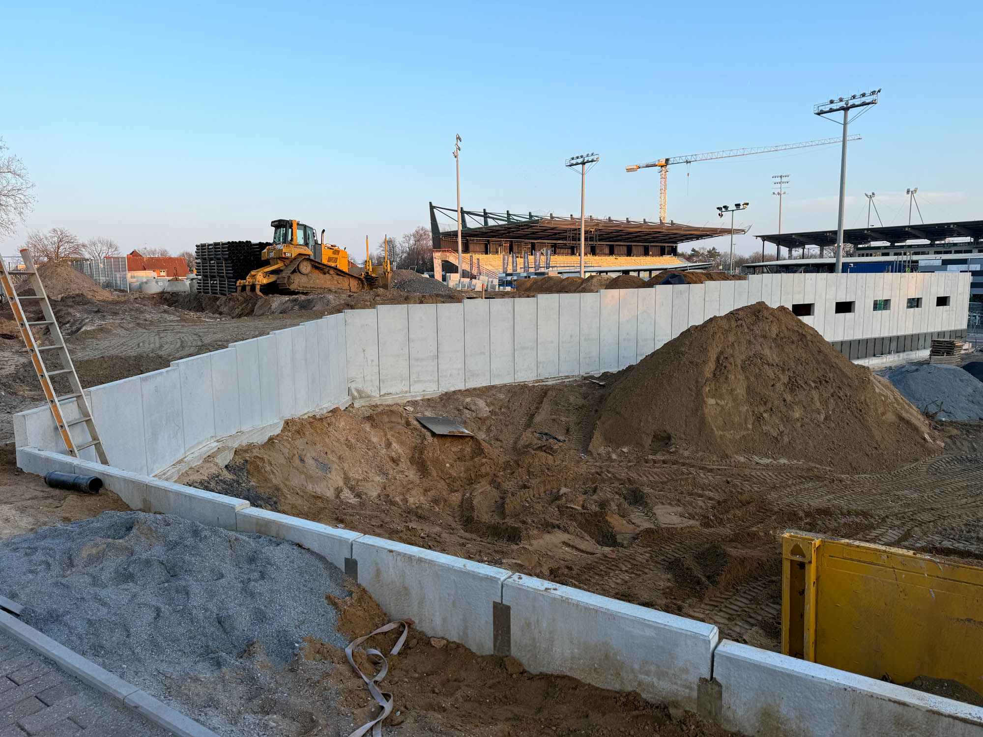 Denn in dieser Woche erhielt der A-Block auf der aktuellen Haupttribüne einen etwas unerwünschten Zuwachs. Zwei sehr wuchtige Stahlkonstruktionen werden in der nächsten Zeit den Blick aus dem A-Block erschweren. Ihre Funktion dürfte auf der Hand liegen: Irgendwann demnächst werden die Arbeiten für das Südost-Eckgebäude mit Kita und Geschäftsstelle starten. Dazu muss das Dach aber aus statischen Gründen gesichert werden. Es ist nämlich nach hinten raus „abgebunden“ und im Boden verankert. Doch die Ausschachtungsarbeiten werden diese Verankerung zumindest näherungsweise erreichen – und man geht hier offensichtlich auf Nummer Sicher.