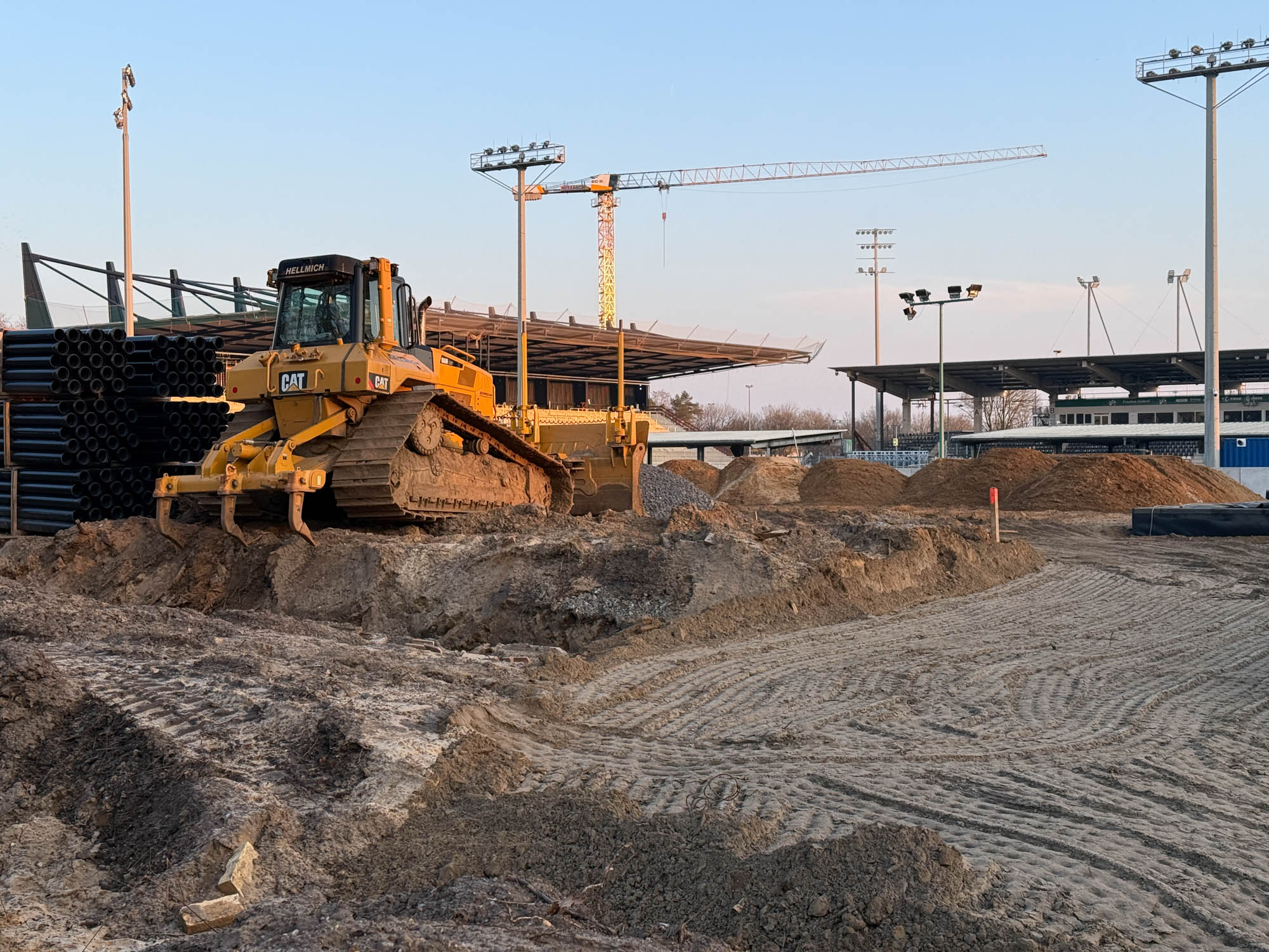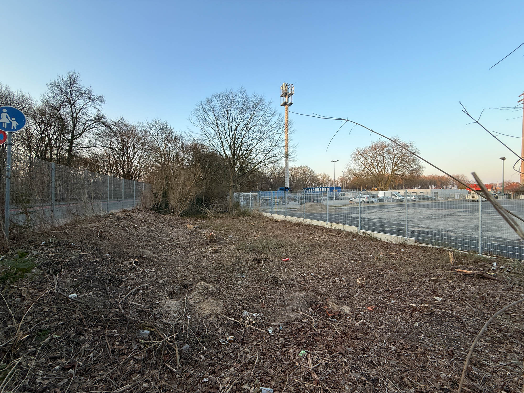 Auf der Gegengerade wird derzeit daran gearbeitet, das Bodenniveau an die Parkplätze anzugleichen. Hier werden künftig einige tausend Fahrradstellplätze entstehen – und in der Mitte die Treppen hinunter zur neuen Nordtribüne.