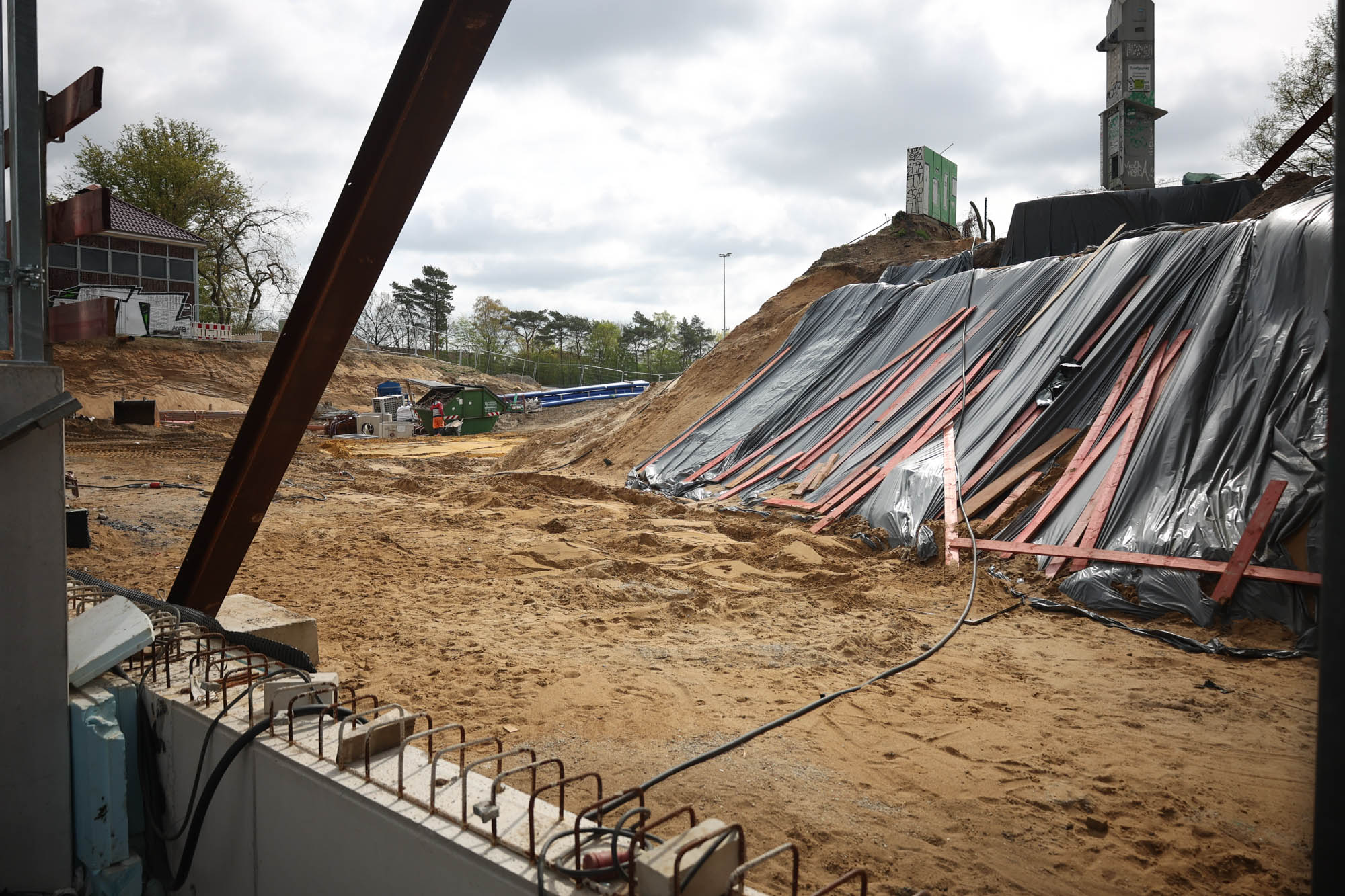 Im Südosten haben bereits die Arbeiten an den Fundamenten für das Eckgebäude begonnen. Zuletzt wurden die Dachträger an der bisherigen Haupttribüne gesichert, um statische Probleme zu verhindern.