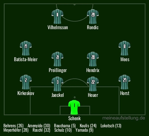 Spannend, ich werde dort sein und freue mich drauf, Ich würde Bouchama und Schenk ersetzen. Nicht, weil die schlecht sind, sondern weil ich Bedenken habe. Bei Bouchama wegen seiner Unkonzentriertheiten und bei Schenk wegen des Drucks. Jaeckel hat mich zuletzt auch nicht überzeugt. Batista-Meier muss über seinen Schatten springen und auch ohne A. Ende überzeugen. Vorne bin ich unsicher, wer spielen sollte. Mees eher mittig.