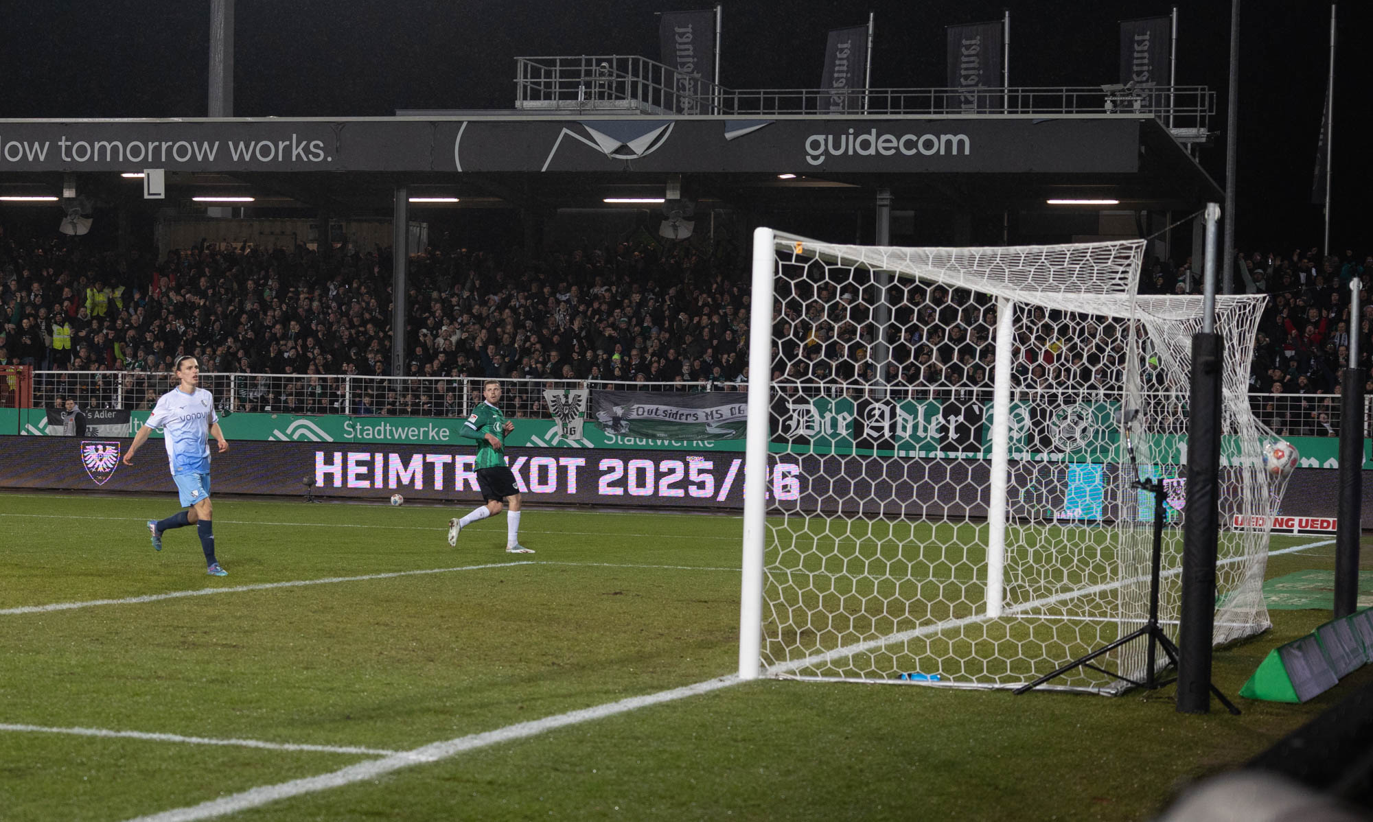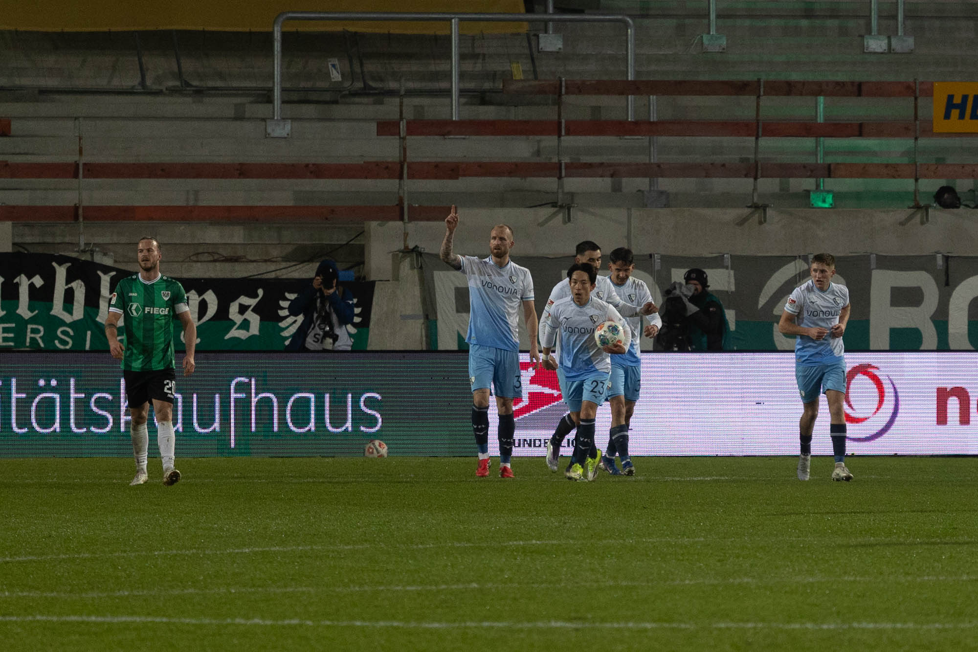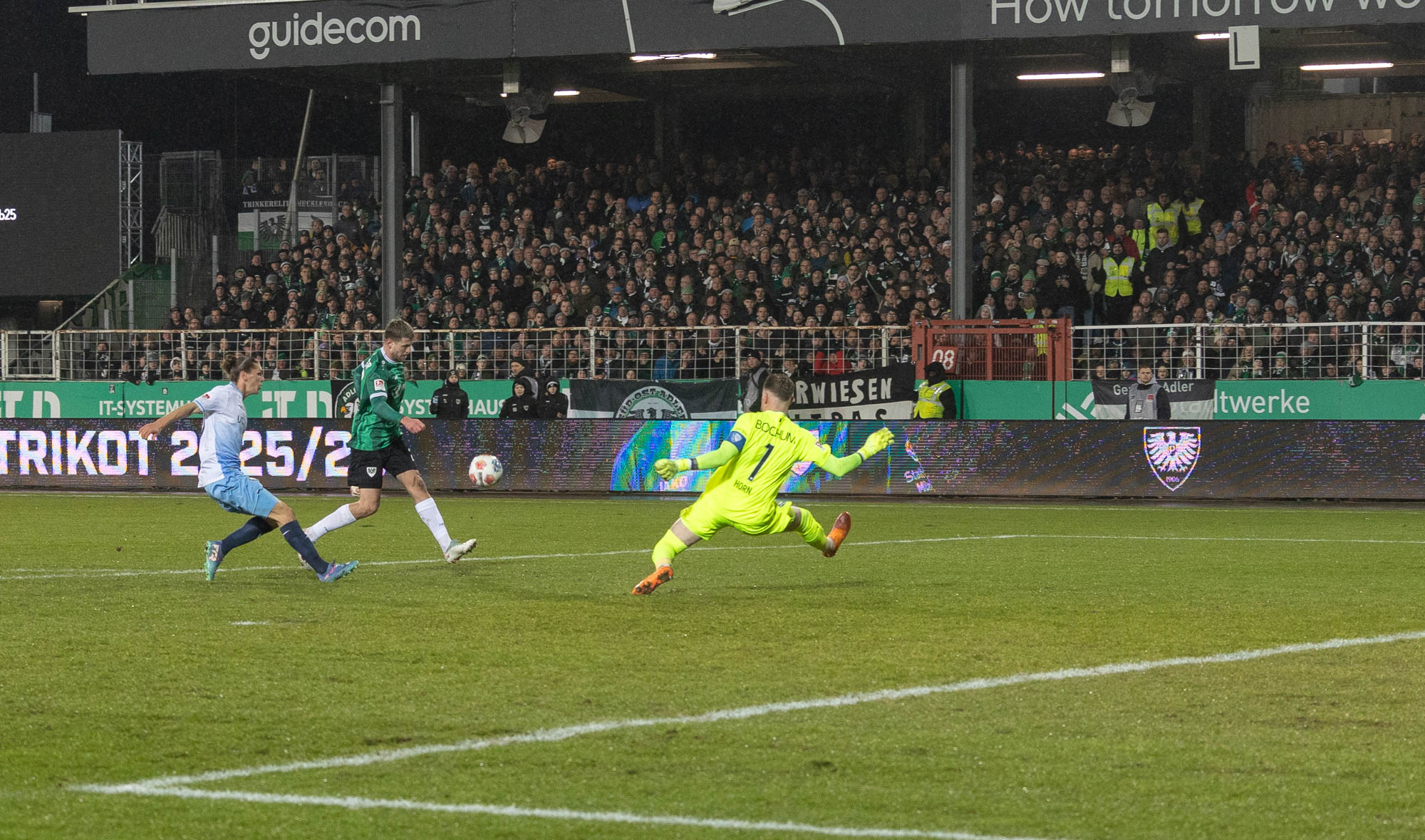 Dem Spielverlauf folgend war die 35. Minute ungewöhnlich: Hendrix steckte da einen Ball großartig auf Rondic durch, der hatte Platz und hatte die Ruhe, den Ball dann über VfL-Keeper Horn zu lupfen. Das 1:0 für die Preußen, was für eine Erleichterung! Das Tor gab auch Sicherheit, das war deutlich zu spüren.